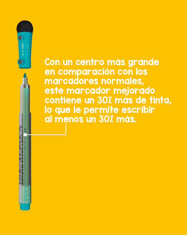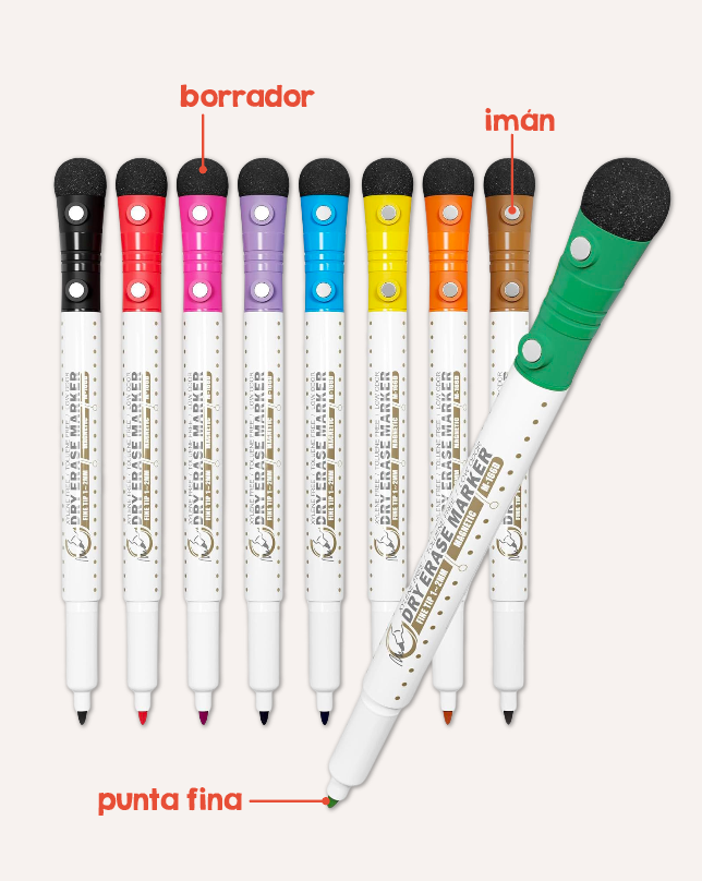 - Las tapas de plumones magnéticos cuentan con borradores de espuma incorporados.