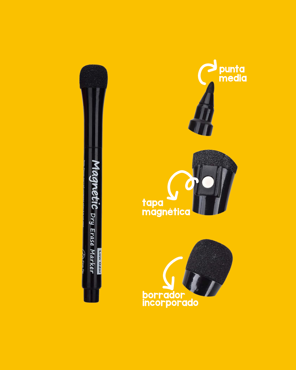 - Las tapas de plumones magnéticos cuentan con borradores de fieltro incorporados. La tinta se borra fácilmente.