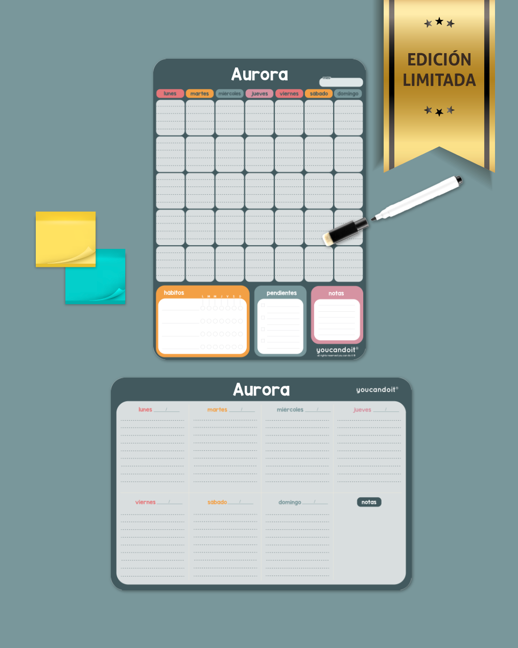 Son ligeras y muy resistentes, puedes escribir y borrar sobre ellas, miden 30X40cm y tienen una cinta de doble contacto instalada para que las puedas colocar sobre cualquier superficie.