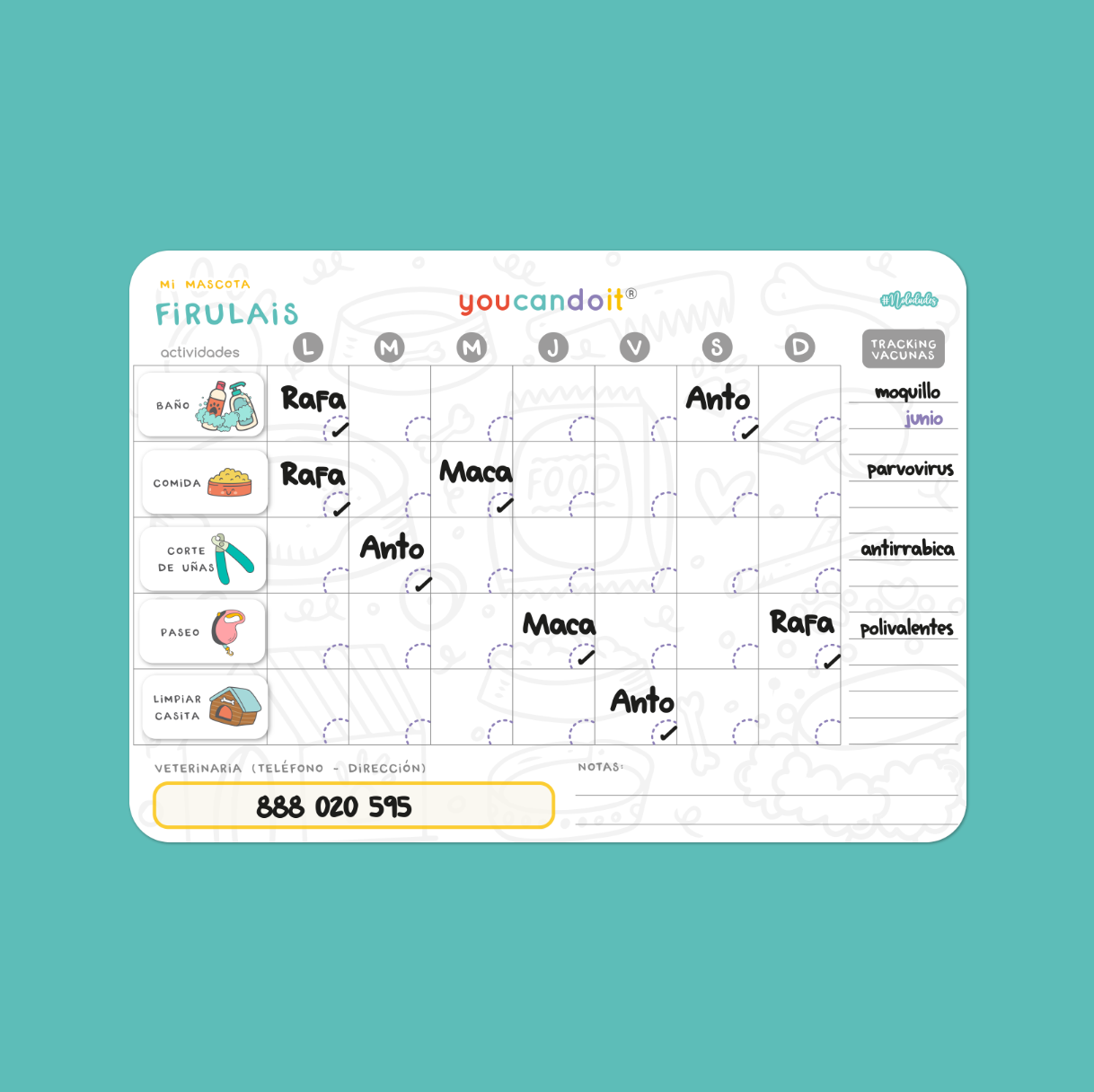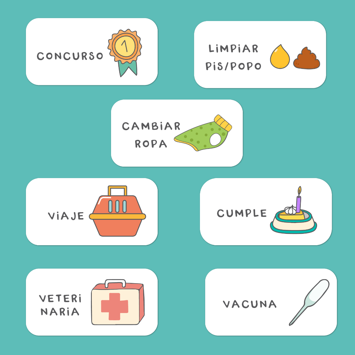 actividades: limpiar pis/popo - limpiar comedero - limpiar cama - limpiar casita - lavar su ropa - cambiar ropa - baño - paseo - jugar - playa - practicar trucos - adiestrar - viaje - compras - comida - dieta - agua - cumple - corte de pelo - corte de uñas - vet - medicina - vacuna - concurso - comprar comida - comprar juguetes - etiquetas para personalizar.
